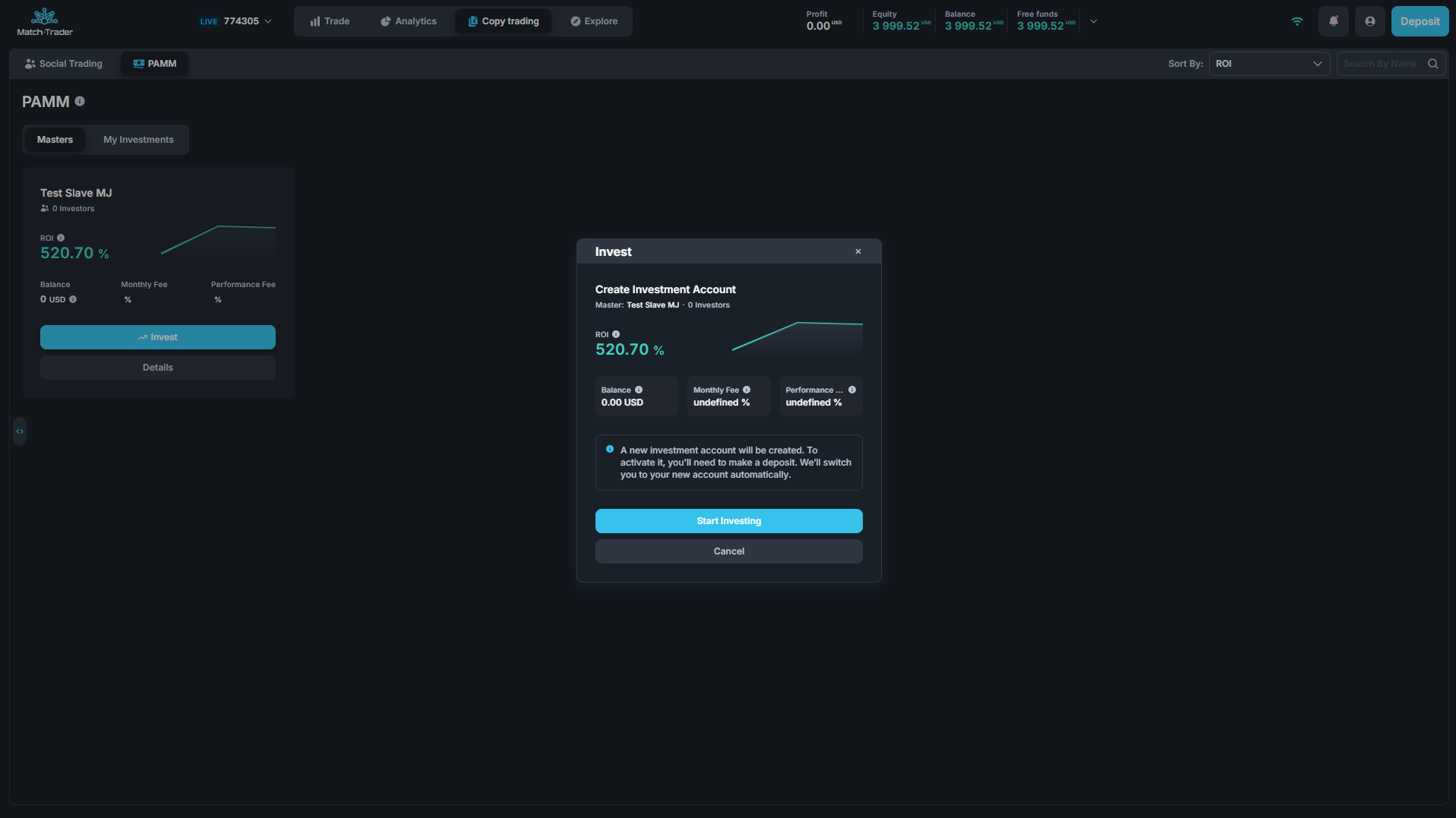 The PAMM module (Percent Allocation Management Module) has been redesigned for the Match-Trader platform, delivering a completely modernized yet familiar user experience within our Social Trading suite. While sporting a sleek, contemporary look, it preserves all existing functionality from the legacy system. All essential tabs and features for production-ready PAMM operations are fully implemented, with exhaustive cross-platform testing ensuring a flawless user transition and strong performance across various resolutions and mobile devices.